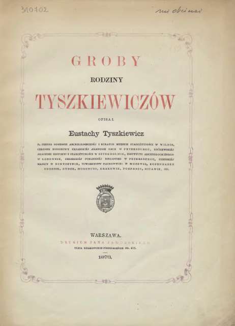 Groby rodziny Tyszkiewiczów / opisał Eustachy Tyszkiewicz. - Warszawa : Druk. J. Jaworskiego, 1873 (Warszawa : Druk. J. Jaworskiego). - [8], 111 s., [16] k. litogr., [2] k. tabl. złoż. ; 28 cm.