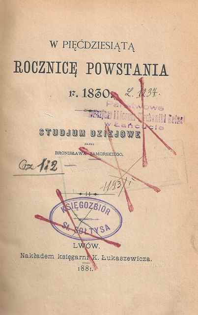 W pięćdziesiątą rocznicę powstania r. 1830 : studjum dziejowe. T. 1-2 / przez Bronisława Zamorskiego. - Lwów : Księg. K. Łukaszewicza, 1881 (Tarnopol : Druk. Podolska). - 2 t. w 1 wol. (XIV, 235 s. : err. ; [2], 251 s. : err.) ; 23 cm.