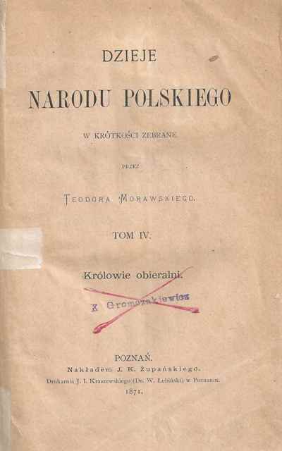 Królowie obieralni / Teodor Morawski. - Poznań : J. K. Żupański, 1871 (Poznań : J. I. Kraszewski (W. Łebiński)). - 2 t. w 1 wol. ([4], 608 s. ; [4], 345, [2] s. : err. ; 22 cm.