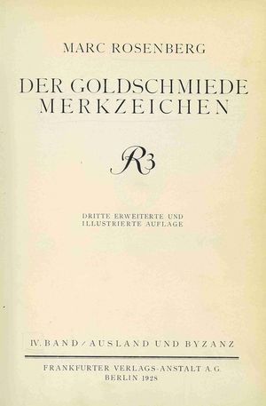 Der Goldschmiede Merkzeichen. Bd. 4, Ausland und Byzanz / Marc Rosenberg. - 3. erweit. und ill. Aufl. - Berlin : Frankfurter Verlagsanstalt, 1928 (Karlsruhe : Buchdruckerei C. F. Müller). - [8], XVII, 821 s., s. tabl. 96-117 : il. ; 25 cm.