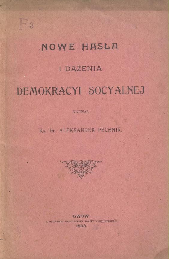 Nowe hasła i dążenia demokracyi socyalnej / napisał Aleksander Pechnik. - Lwów : Druk. Katolicka Józefa Chęcińskiego, 1903 (Lwów : Druk. Katolicka Józefa Chęcińskiego). - 100, [1] s. ; 22 cm.