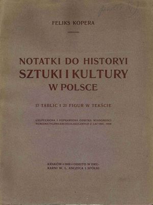 Notatki do historyi sztuki i kultury w Polsce : 17 tablic i 21 figur w tekście / Feliks Kopera. - Kraków : nakładem autora, 1909 (Kraków : odbito w Drukarni W. L. Anczyca i Spółki). - [4] s., 78 szp., [1] s., [11] k. tabl. : il., err. ; 32 cm.