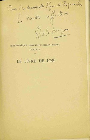 Le livre de Job / trad. de l'hébreu par Edmée Delebecque ; avec un préf. de Israël Lévy. - Paris : Ernest Leroux, 1914 (Le Puy : Imprimerie Peyriller, Rouchon et Gamon). - [4], III, 123 s. ; 17 cm.