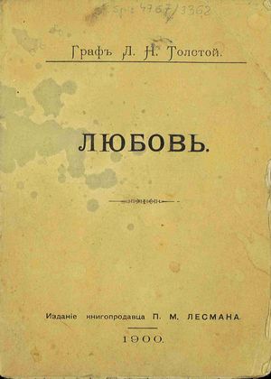 Lûbov / graf L. N. Tolstoj. - [Moskva] : Izdanie Knigoprodavca P. M. Lesmana, 1900 (Melitopol : Tipo-Litografiâ L. L. Libermana). - [2], 31 s. ; 18 cm.