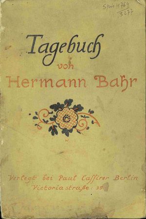 Tagebuch / Hermann Bahr. - Berlin : Paul Cassirer, 1909 (Roitzsch : Buchdruckerei Roitzsch, Albert Schulze). - [4], 268 s. ; 19 cm.