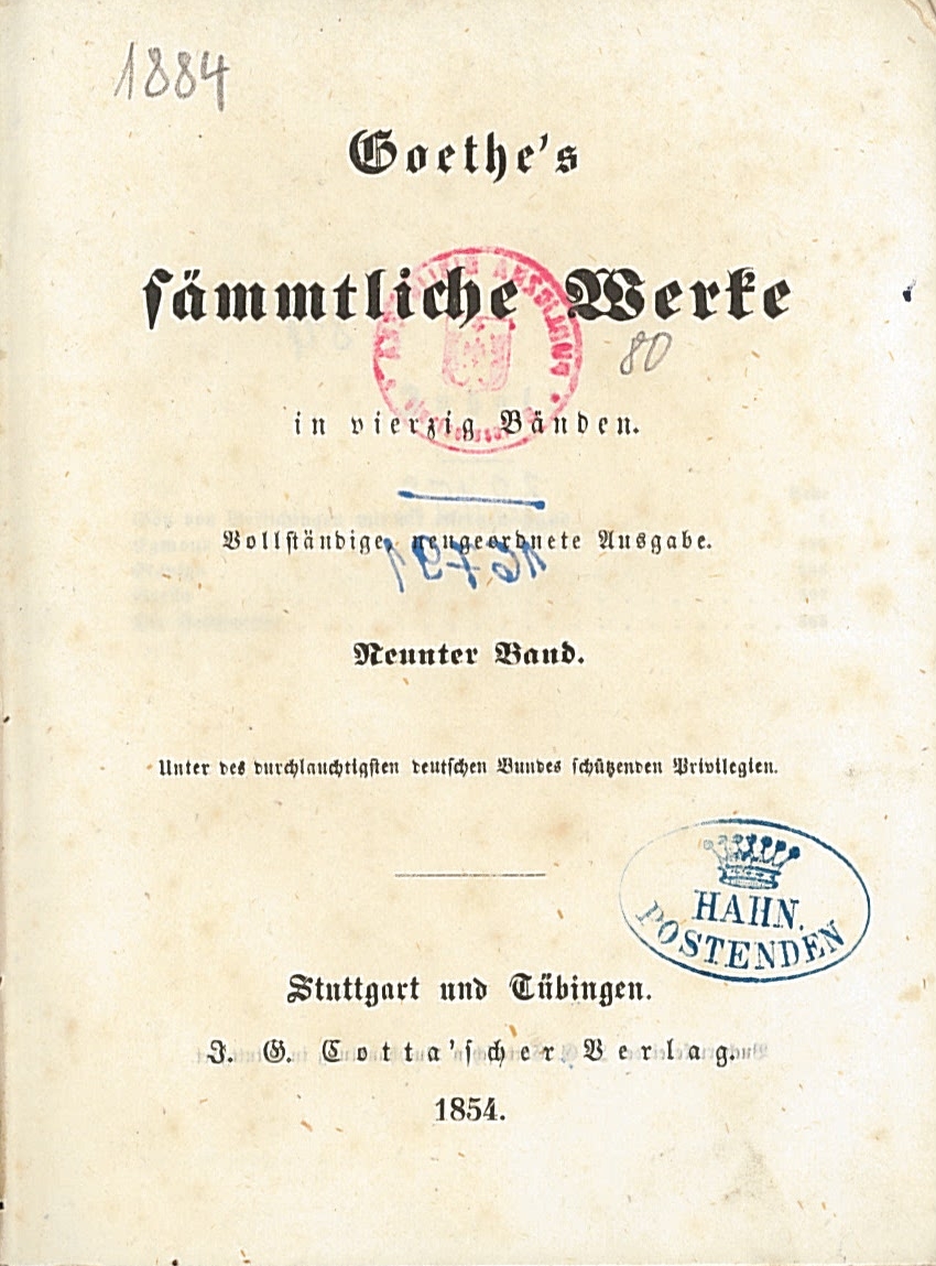Goethe's Sämmtliche Werke : in vierzig Bänden. Bd. 9. - Vollst. neugeordnete Ausg. - Stuttgart ; Tübingen : J. G. Cotta'scher Verlag, 1854. - [4], 388 s. ; 16 cm.