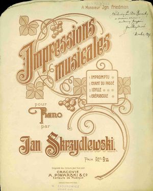 Impressions musicales : pour piano / par Jan Skrzydlewski. - Cracovie : A. Piwarski & Co., [1907] (Leipzig : Inst. Lith. de C. G. Röder). - 15 s. ; 34 cm.
