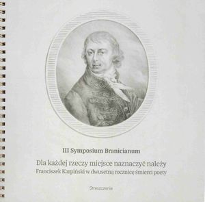 Gurłacz Zuzanna. Red. Bajer Michał (1981- ). Wiara, prawa i obyczaje Indianów: konteksty i strategie przyswojenia rozprawy Josepha Françoisa Michauda Bąkowska Patrycja. Franciszka Karpińskiego refleksje antropologiczne - kilka słów o Rozmowach Platona z uczniami swoimi Bober-Jankowska Magdalena. Wiara, prawa i obyczaje Indianów: konteksty i strategie przyswojenia rozprawy Josepha Françoisa Michauda Borawski Cezary. Między modlitwą a westchnieniem: miłość boska i ludzka w poezji Karpińskiego jako napięcie mistyczno-erotyczne Chachaj Małgorzata. Wydanie wiersza Franciszka Karpińskiego O powinnościach obywatela jako druku ulotnego w 1830 roku Chachulski Tomasz. Krewni i spadkobiercy poety - rozmowa z panią Justyną Kozierowską Cieński Marcin (1959- ). Rzeki Karpińskiego Dąbrowski Roman (1961- ). Rozmowy Platona z uczniami swoimi. Dialogowy namysł nad sprawami Boga, człowieka i jego kondycji. Wybrane problemy Dobrzyńska Teresa (1943- ). Echa kolędy Bóg się rodzi w katastroficznym wierszu Tomasza Różyckiego Janicka Anna (1968- ). Franciszek Karpiński: fragmenty pozytywistycznego dyskursu Kaliszewski Wojciech (1956- ). Franciszek Karpiński - poeta z Bożej Łaski Koehler Krzysztof (1963- ). Polityczność w dziele/dzieła Franciszka Karpińskiego Kostkiewiczowa Teresa (1936- ). Franciszek Karpiński: trajektoria życia, kręgi twórczości Kowal Jolanta (1974- ). Franciszek Karpiński w prasie wileńskiej I połowy XIX wieku. Glosa do dziejów recepcji Kuczera-Chachulska Bernadetta (1957- ). Liryka Franciszka Karpińskiego. Próg romantyzmu? Ławski Jarosław (1968- ). Leszek Aleksander Moczulski - poeta serca? Maksimowicz Krystyna (1944- ). Powiązania Franciszka Karpińskiego z domem Rzewuskich Myszor-Ciecieląg Monika. Franciszka Smuglewicza Rodzina Prozorów. Historia jednego obrazu Nieciecki Jan (1948- ). Wiersz Franciszka Karpińskiego Na Wokluz, wody i dom gocki pod Białymstokiem jako źródło do rekonstrukcji planu ogrodu Izabeli Branickiej w Bażantarni Niziołek Piotr (muzealnictwo). Między złotym, rublem i talarem. Franciszek Karpiński a pieniądze Partyka Magdalena (literaturoznawstwo). Dzieciństwo (nie)sentymentalne. Karpińskiego głos w sprawie wychowania Piotrowski Igor (1979- ). Fantazja na tematy polskie. Filon z Laurą i bez Laury, czyli twórczość Karpińskiego w imaginarium i codzienności Polaków Reginek Antoni (1948- ). Umuzycznienie utworów Franciszka Karpińskiego z jego zbioru Pieśni nabożne - jak spełniła się zapowiedź poety "Moje pieśni... śpiewać w kościele będą" Ryżewski Grzegorz (1974- ). Franciszek Karpiński a dobra Suchodolina w ekonomii grodzieńskiej Shkurgan Oksana. Recepcja utworów z cyklu Pieśni nabożnych Franciszka Karpińskiego w środowisku oo. Benonitów warszawskichna przełomie XVIII i XIX wieku Snopek Jerzy (1952- ). Franciszek Karpiński w oczach współczesnych i potomnych Suska Marzena. "Całe się pole zazieleniło - mojej pszenicy nie widać!". Symbolika zieleni w poezji Franciszka Karpińskiego Wójcicki Jacek. Homer żydowski na skale pięknej Kallijopy. Psalmiczny agon Franciszka Karpińskiego z Janem Kochanowskim Zabielski Łukasz (1985- ). Osjanizm Franciszka Karpińskiego Zając Grzegorz (1969- ). Sentymentalny krytyk o czułym poecie - Kazimierz Brodziński (nie tylko) chwali Franciszka Karpińskiego Żukowska Kamila (1987- ). "Czy poza mądrością bogowie dali coś człowiekowi lepszego?" O obrazie przyjaźni w utworach Franciszka Karpińskiego w kontekście oświeceniowej refleksji nad przyjaźnią