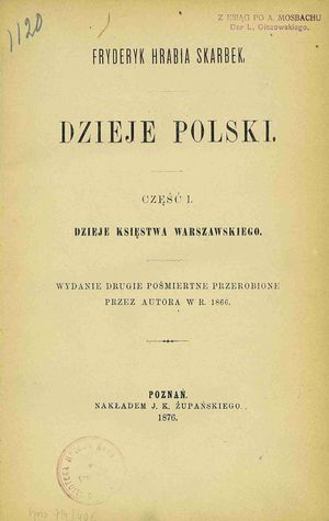 Dzieje Polski. Cz. 1, Dzieje Księstwa Warszawskiego. T. 1 / Fryderyk Skarbek. - Wyd. 2 pośmiertne przerobione przez Autora w r. 1866. - Poznań : nakładem J. K. Żupańskiego, 1876 (Poznań : Czcionkami M. Marxa). - [2], X, 222, [2] s. ; 23 cm.