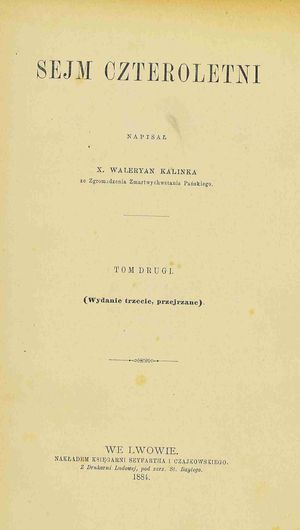 Sejm Czteroletni. T. 2 / napisał Waleryan Kalinka. - Wyd. 3, przejrz. - Lwów : nakładem Księgarni Seyfartha i Czajkowskiego, 1884 (Lwów : Z Drukarni Ludowej pod zarządem St. Baylego). - VII, [2], 295 s. ; 23 cm.