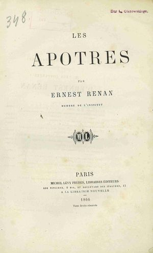 Les apôtres / par Ernest Renan. - Paris : Michel Lévy, frères, Libraires éditeurs, 1866 (Paris : J. Claye). - [4], LXIV, 388 s. ; 23 cm + Extrait du catalogue de Michel Lévy : 32 s. ; 23 cm.