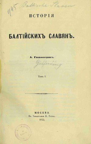 Istorìâ baltìjskih slavân A. Gilʹferdinga. T. 1. - Moskva : [b. w.], 1855 (Moskva : v Tipografìi V. Got'e). - X, 322 s. ; 26 cm.