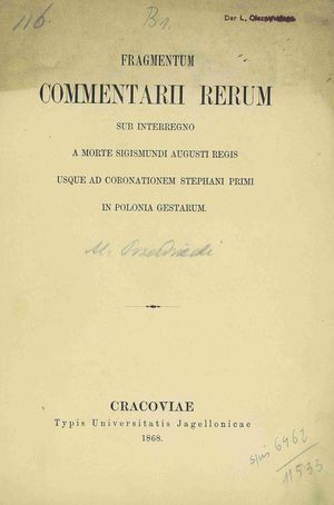Na s. 32: Ex Cod. Mass. incerti auctoris, fortasse Christoph. Warsevicii, in thecis Naruszevicianis bibliothecae Vladislai Principis Czartoryski asservato.