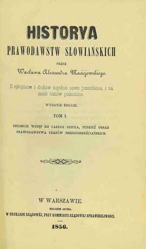 Historya prawodawstw słowiańskich. T. 1, Obejmuje wstęp do całego dzieła, tudzież obraz prawodawstwa czasów przedchrześciańskich / przez Wacława Alexandra Maciejowskiego. - Wyd. 2., z rękopisów i druków zupełnie nowo przerobione i na sześć tomów podzielone. - Warszawa : nakładem autora, 1856 (Warszawa : Drukarnia Rządowa, przy Kommissyi Rządowej Sprawiedliwości). - [4], VI, 600 s. : err. ; 23 cm.