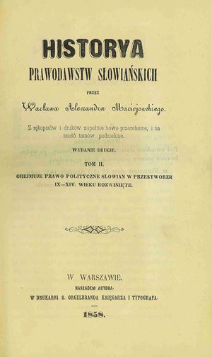 Historya prawodawstw słowiańskich. T. 2, Obejmuje prawo polityczne Słowian w przestworze IX-XIV wieku rozwinięte / przez Wacława Alexandra Maciejowskiego. - Wyd. 2., z rękopisów i druków zupełnie nowo przerobione i na sześć tomów podzielone. - Warszawa : nakładem autora, 1858 (Warszawa : Drukarnia S. Orgelbranda księgarza i typografa). - [2], VI, 378 s. ; 23 cm.