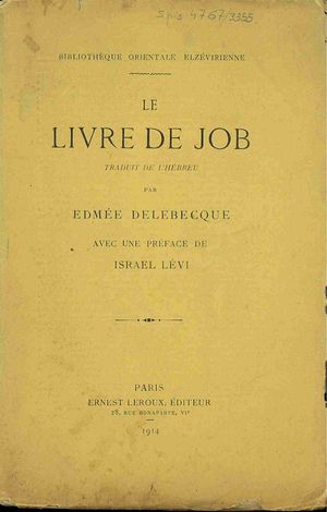 Le livre de Job / trad. de l'hébreu par Edmée Delebecque ; avec un préf. de Israël Lévy. - Paris : Ernest Leroux, 1914 (Le Puy : Imprimerie Peyriller, Rouchon et Gamon). - [4], III, 123 s. ; 17 cm.