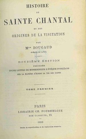 Histoire de Sainte Chantal et des origines de la visitation. T. 1 / par Mgr Bougaud. - 2. éd. - Paris : Librairie Ch. Poussielgue, 1892 (Tours : Impr. Mame). - [4], 648 s., [1] k. tabl. ; 18 cm.