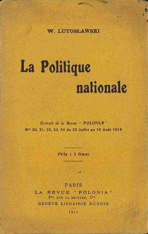 La politique nationale / W. Lutosławski. - Paris : La Revue "Polonia" ; Genève : Librairie Kündig, 1916 (Paris : Imprimerie Levé). - 39 s. ; 18 cm.