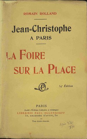 La foire sur la place / Romain Rolland. - 34. éd. - Paris : Librairie Paul Ollendorff, [1908] (Saint-Denis : Imprimerie Ve Bouillant et J. Dardaillon). - [4], VIII, 319, [1] s. ; 19 cm.