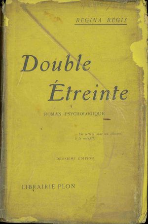 Double étreinte : roman psychologique / Régina Régis. - Paris : Librairie Plon. Plon-Nourrit et Cie, cop. 1912 (Paris : Typ. Plon-Nourrit et Cie). - [4], 251 s. ; 19 cm.