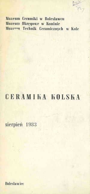 Ceramika kolska : sierpień 1983. - Bolesławiec : Muzeum Ceramiki w Bolesławcu, [1983]. - Składanka ([6] s. : il.) ; 21 cm.