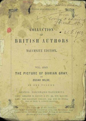 The Picture of Dorian Gray / by Oscar Wilde. - Leipzig : Bernhard Tauchnitz, 1908 (Leipzig : Printing Office of the Publisher). - 287, 31, [1] s. ; 17 cm.