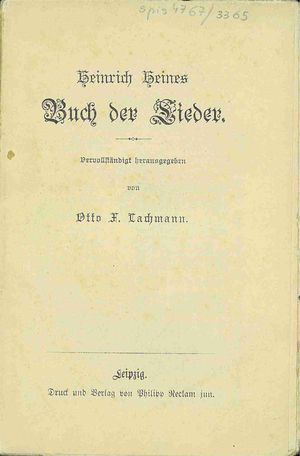 Heinrich Heines Buch der Lieder / vervollständigt hrsg. von Otto F. Lachmann. - Leipzig : Verlag von Philipp Reclam jun., [b. r.] (Leipzig : Philipp Reclam jun.). - 255 s. ; 15 cm.