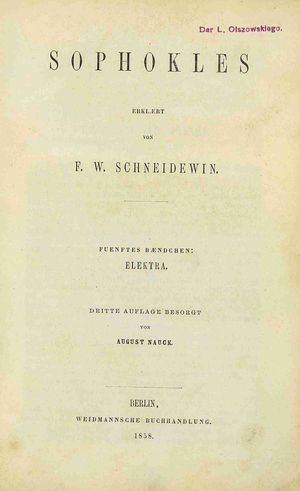 Sophokles / erkl. von F. W. Schneidewin. - 3. Aufl. - Berlin : Weidmannsche Buchhandlung, 1855 (Berlin : Druck von Carl Schultze). - XL, 280 s. ; 20 cm.