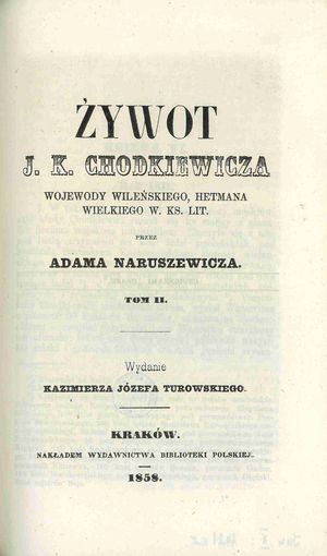 Żywot J. K. Chodkiewicza wojewody wileńskiego, hetmana wielkiego W. Ks. Lit. T. 2 / przez Adama Naruszewicza. - Wydanie / Kazimierza Józefa Turowskiego. - Kraków : nakładem Wydawnictwa Biblioteki Polskiej, 1858 (Kraków : czcionkami "Czasu"). - 279 s. ; 20 cm.