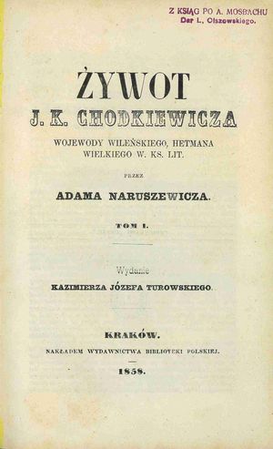 Żywot J. K. Chodkiewicza wojewody wileńskiego, hetmana wielkiego W. Ks. Lit. T. 1 / przez Adama Naruszewicza. - Wydanie / Kazimierza Józefa Turowskiego. - Kraków : nakładem Wydawnictwa Biblioteki Polskiej, 1858 (Kraków : czcionkami "Czasu"). - 268 s. ; 20 cm.