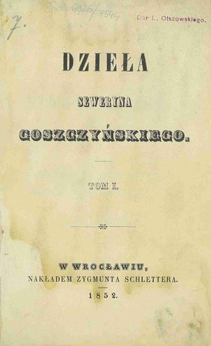 Dzieła Seweryna Goszczyńskiego. T. 1, [Powieści prozą]. - Wrocław : nakładem Zygmunta Schlettera, 1852 (Wrocław : Czcionkami C. H. Storcha i Sp.). - XV, [1], 214, [1] s. ; 17 cm.